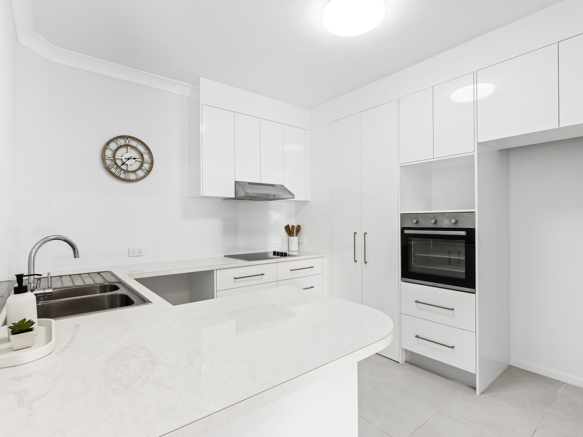 Modern kitchen equipped with plenty of benchtop and pantry space.