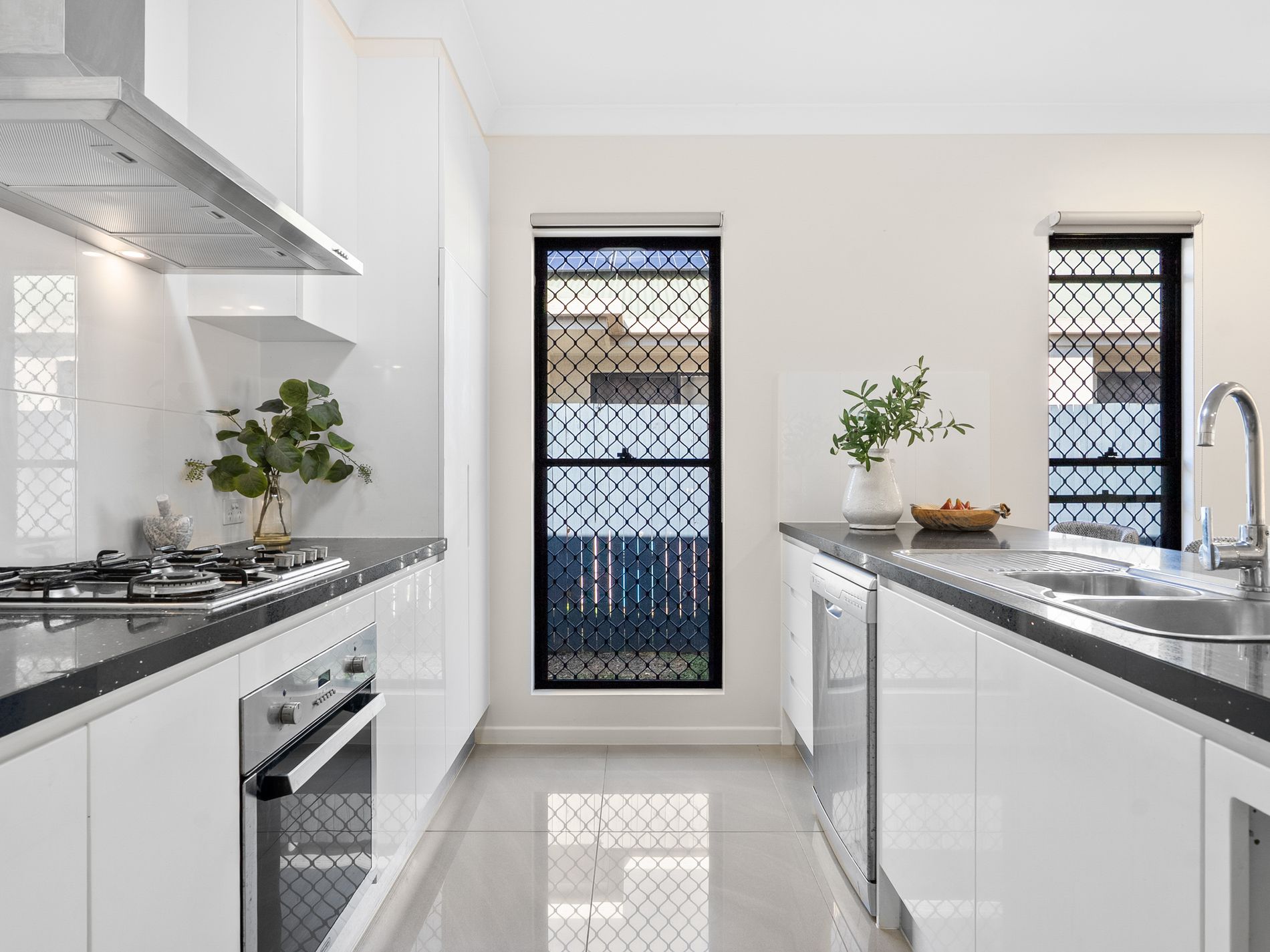 Modern galley style kitchen with granite benchtops, gas cooktop, rangehood, and ample storage