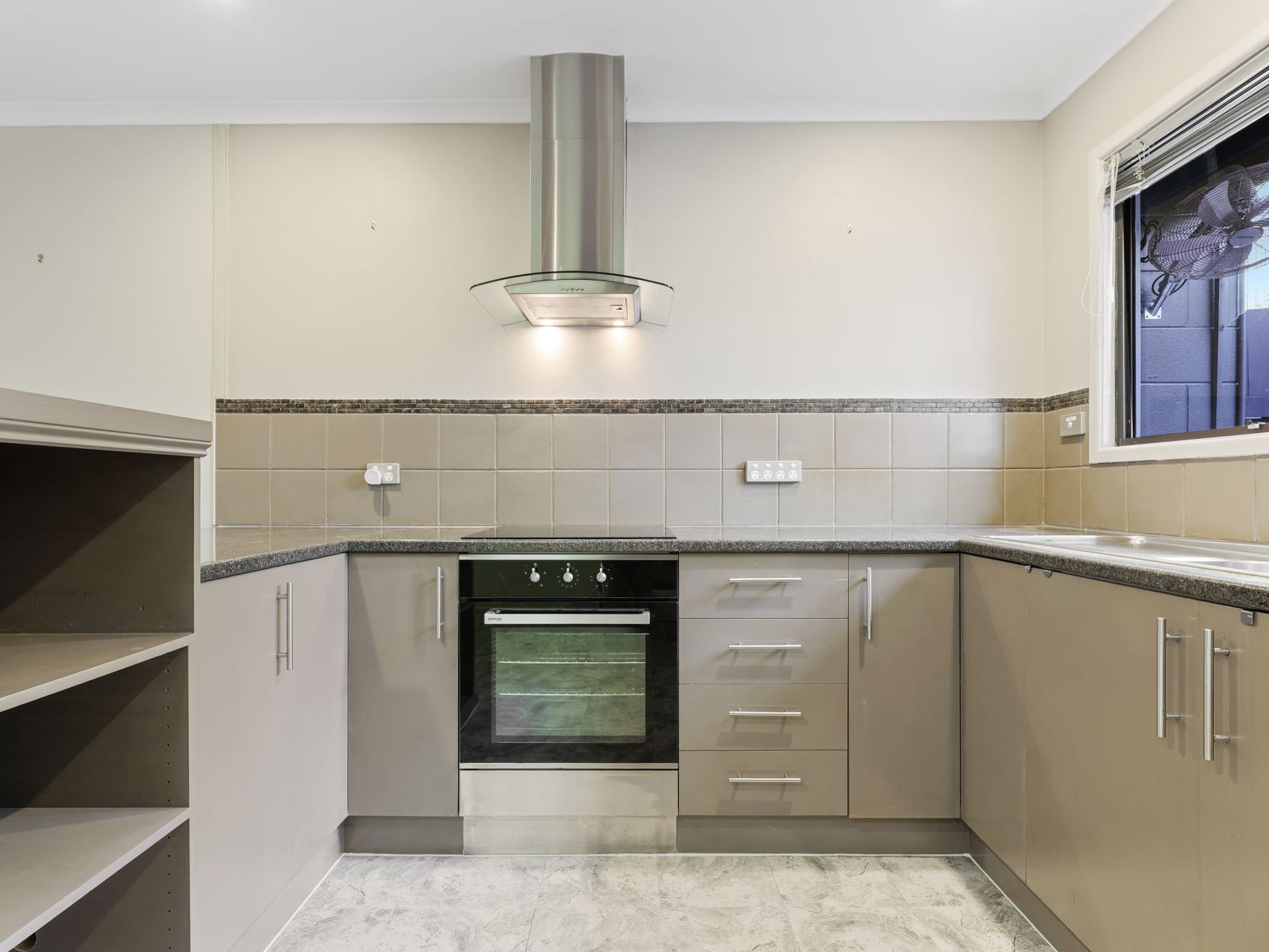 Compact kitchen with ample bench space and functional layout.