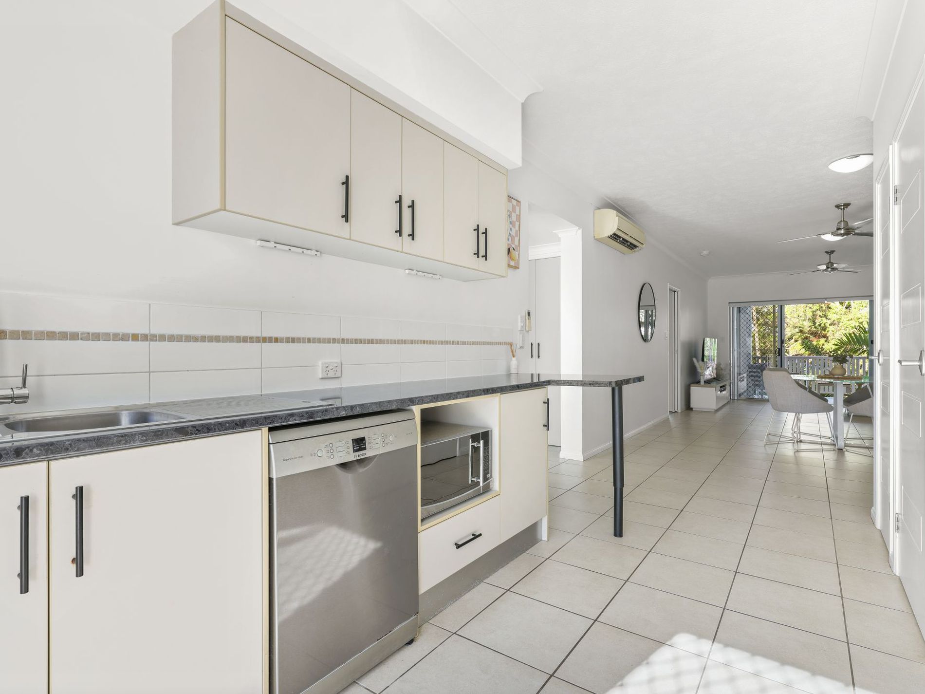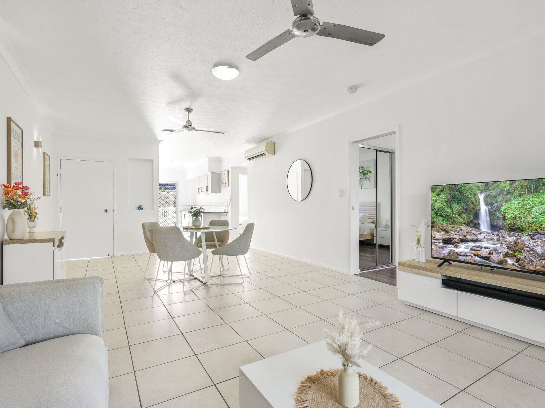 Tiled open plan living and dining with spilt system air-conditioning, flowing seamlessly onto the outdoor entertaining area.